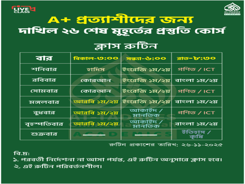 পরীক্ষায় সর্বোচ্চ কমন পেয়ে সেরা ফলাফল অর্জন করতে, এখনই ভর্তি হয়ে যাও আমাদের “দাখিল ২০২৬ শেষ মুহূর্তের প্রস্তুতি কোর্সে”